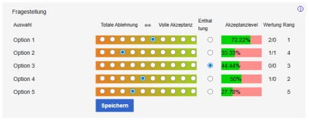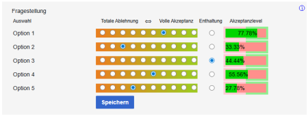 Die Mehrfachauswahl wird verwendet, wenn mehrere der Optionen gleichzeitig auch umgesetzt werden kann/soll. Dabei wird ein Schwellwert von 50% Akzeptanz definiert. Alles oberhalb dieses Schwellwerts soll umgesetzt werden, alles darunter nicht. Dieser Schwellwert ist im Hintergrund farblich markiert (siehe Abbildung 2).